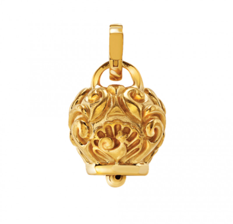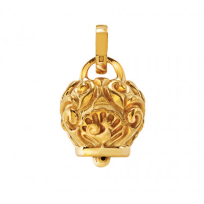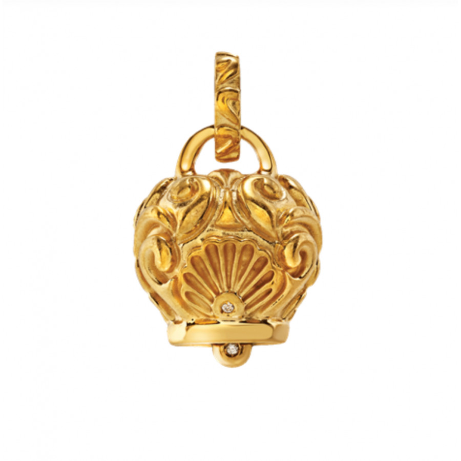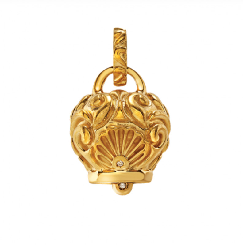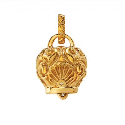 Ciondolo Chantecler Campanella grande, con volute barocche sbalzate a mano in argento dorato e diamanti taglio brillante, appartenente alla collezione Et Voilà.