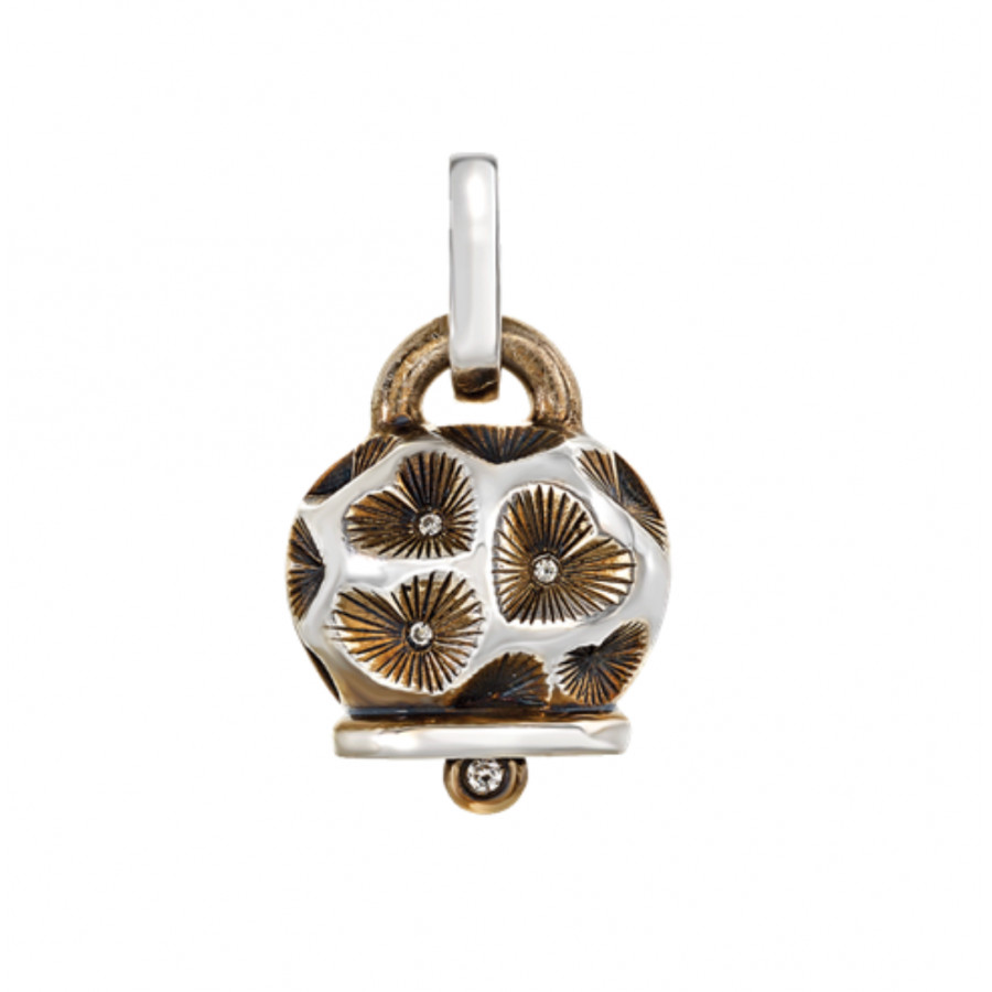 Ciondolo Chantecler Campanella grande con cuori incisi a mano in argento invecchiato e diamanti taglio brillante, appartenente alla collezione Et Voilà.