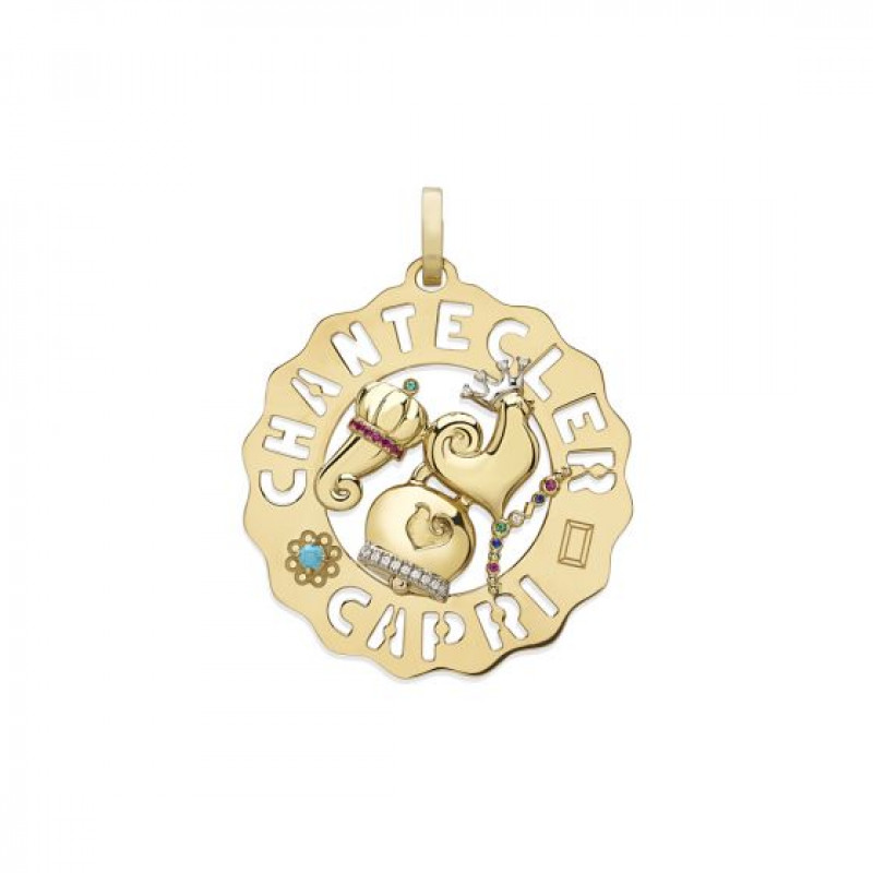 Ciondolo grande Gallo, Campanella, Cornetto in oro giallo, diamanti, rubini, zaffiri blu, smeraldi e turchese, di Chantecler appartenente alla collezione Logo.