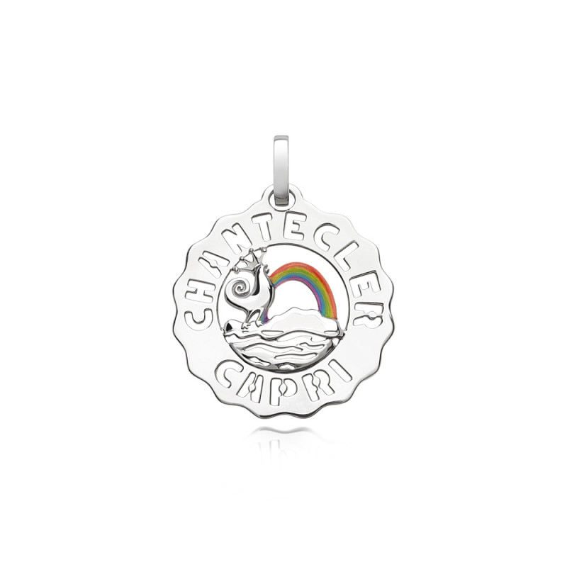Ciondolo piccolo gallo e arcobaleno in argento e smalti colorati, appartenente alla collezione Logo.