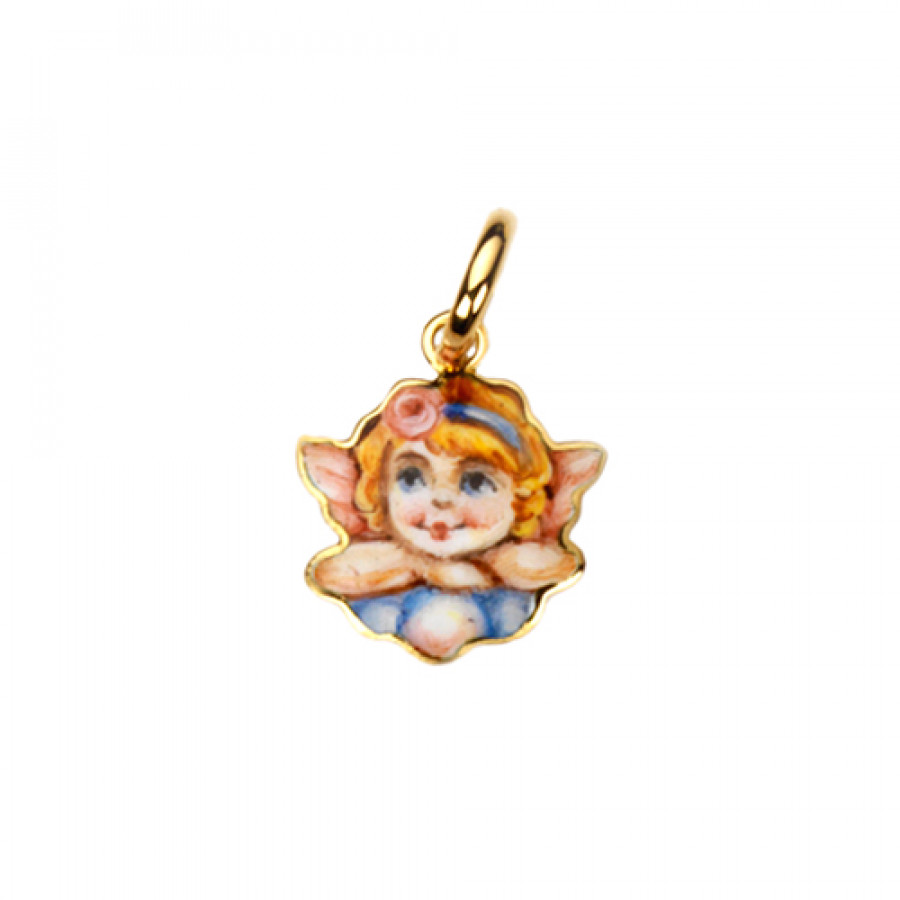 Ciondolo realizzato in oro 18 carati con Angioletto su nuvolette e ali color rosa. Il ciondolo è dipinto a mano con smalti a gran fuoco. Gli Angioletti sono da sempre un simbolo positivo di buon augurio associato alla Famiglia, regalo ideale sia per adulti e piccolini.