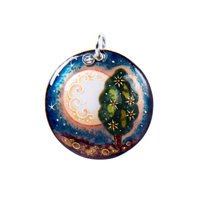 Questo ciondolo è dipinto a mano su sagoma in rame con smalti a gran fuoco ed è in grado di trattenere le gocce di profumo e rilasciarle lentamente.