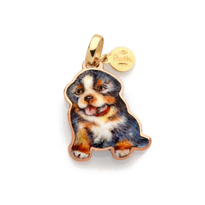 Dalla collezione Cuccioli, la linea di gioielli Gabriella Rivalta dedicata al mondo degli animali, qui il ciondolo interamente artigianale con cane bernese. Il ciondolo è minuziosamente dipinto a mano con smalti a gran fuoco su sagoma in rame puro con biglierina e marchietto in oro 18 carati.