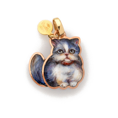 Dalla collezione Cuccioli, la linea di gioielli Gabriella Rivalta dedicata al mondo degli animali, qui il ciondolo interamente artigianale con gatto persiano grigio. Il ciondolo è minuziosamente dipinto a mano con smalti a gran fuoco su sagoma in rame puro con biglierina e marchietto in oro 18 carati.