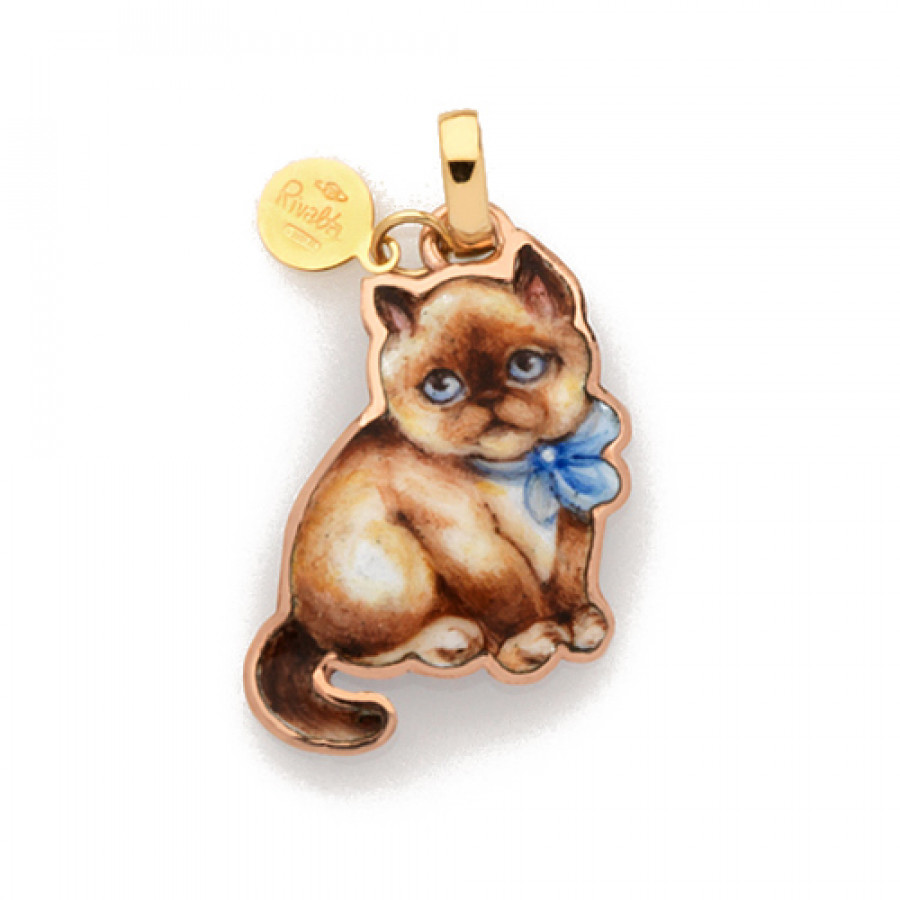 Dalla collezione Cuccioli, la linea di gioielli Gabriella Rivalta dedicata al mondo degli animali, qui il ciondolo interamente artigianale con gatto siamese . Il ciondolo è minuziosamente dipinto a mano con smalti a gran fuoco su sagoma in rame puro con biglierina e marchietto in oro 18 carati.