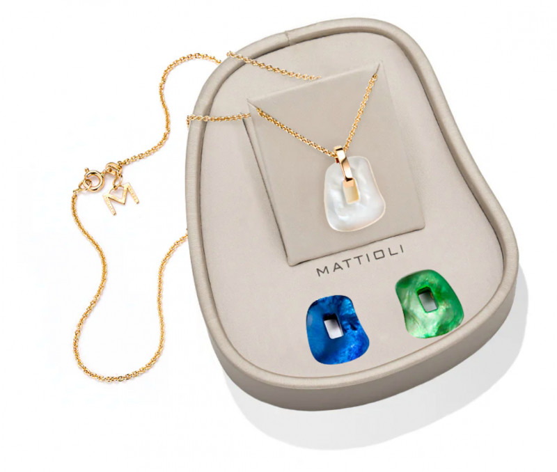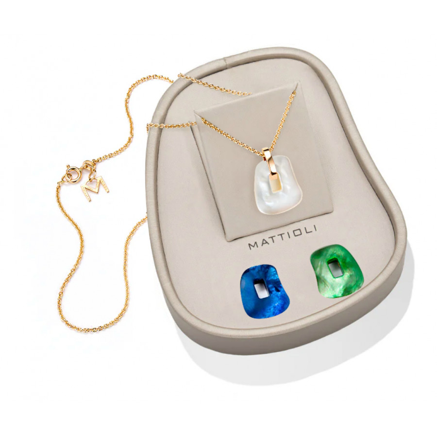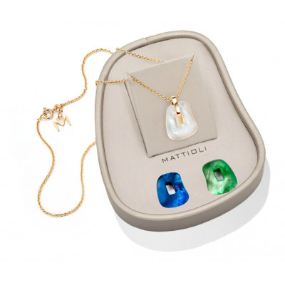Box Ciondolo Mattioli piccoli e catenina in oro giallo e tre trapezi colorati intercambiabili della collezione Puzzle