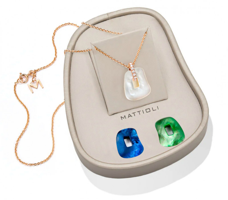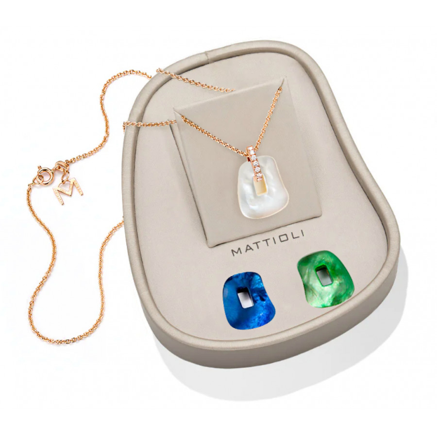 Box Ciondolo Mattioli piccoli e catenina in oro rosa, diamanti bianchi 0,18 ct. e tre trapezi colorati intercambiabili della collezione Puzzle