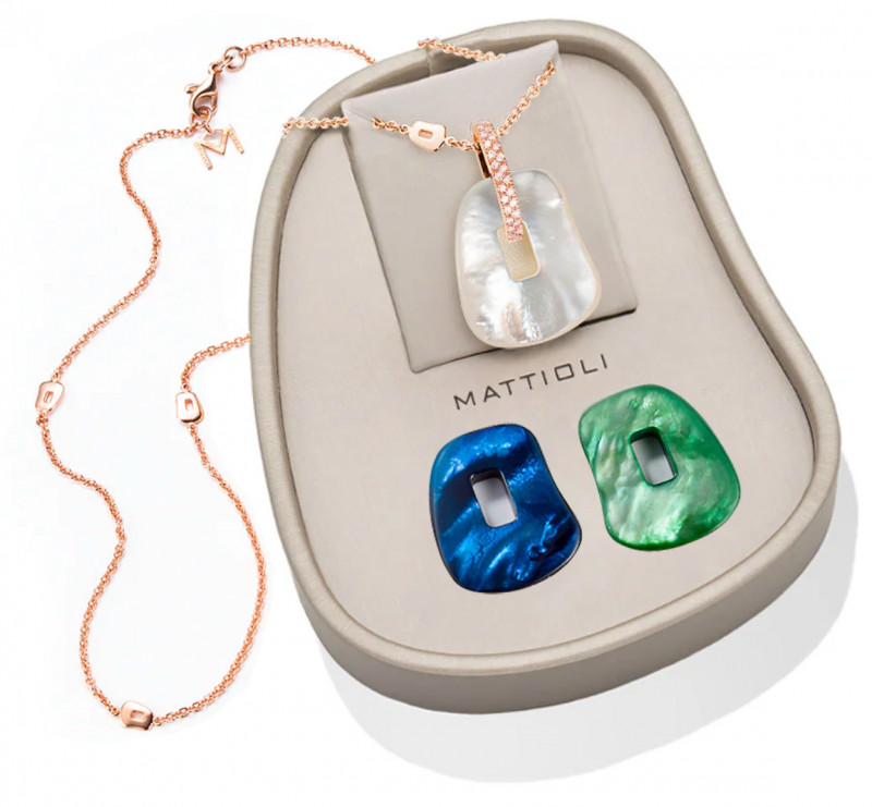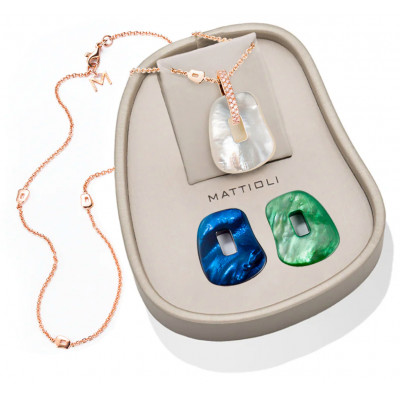 Box Ciondolo Mattioli medi e catenina in oro rosa e diamanti brown e tre trapezi colorati intercambiabili della collezione Puzzle
