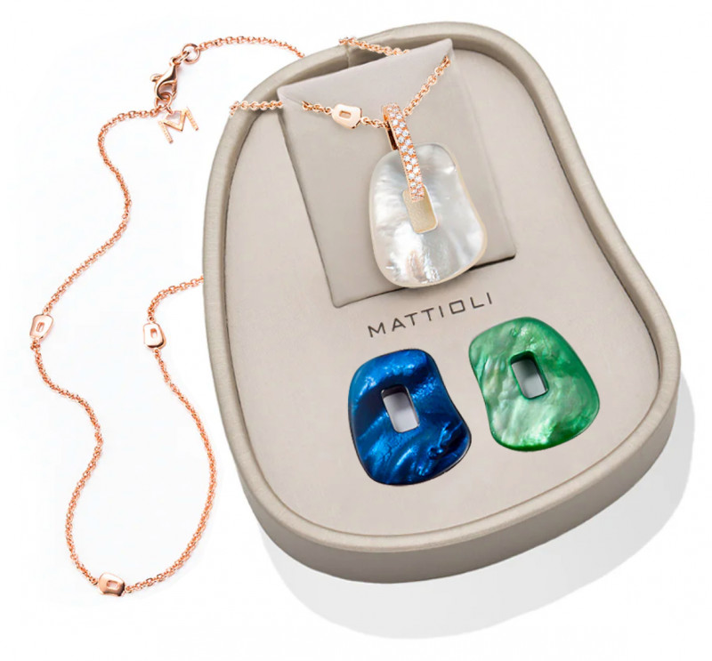 Box Ciondolo Mattioli medi e catenina in oro rosa e diamanti bianchi e tre trapezi colorati intercambiabili della collezione Puzzle