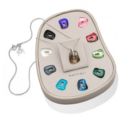 Box Ciondolo Mattioli piccoli e catenina in oro bianco, diamanti bianchi e 11 trapezi colorati intercambiabili della collezione Puzzle