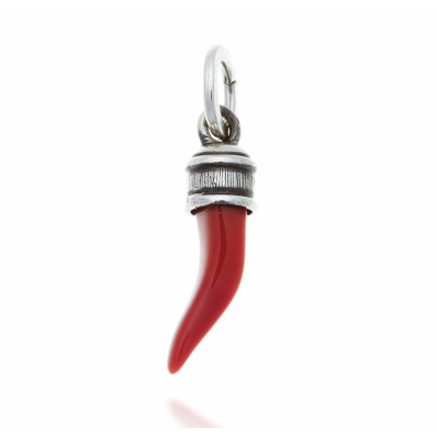 Un piccolo charm in argento con un piccolo corno rosso porta fortuna