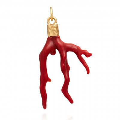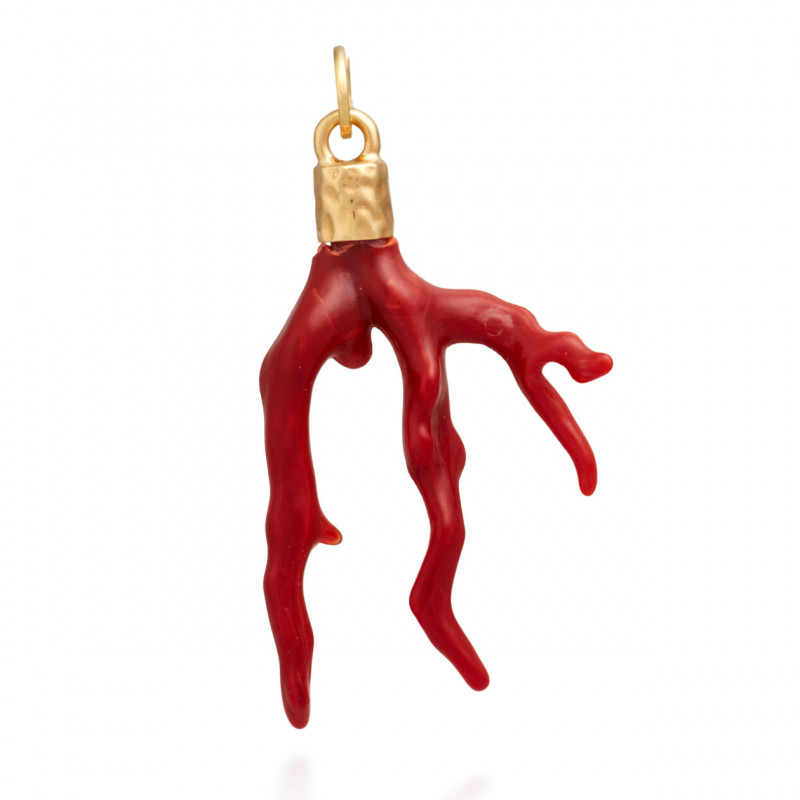 Un charm luminoso e colorato che si inserisce nella grande tradizione del brand Giovanni Raspini. E' realizzato con un elemento in argento fuso a cera persa, quindi martellato a mano e dorato, a cui è appeso un grande corallo rosso in resina ecologica.