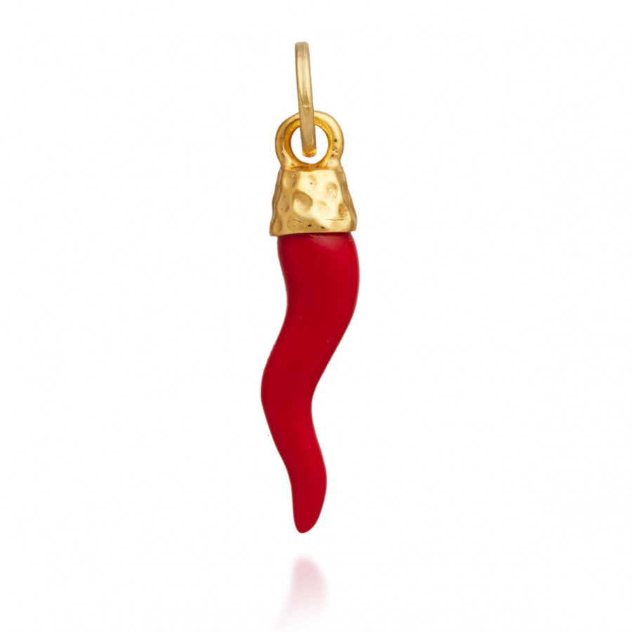 Scaramantico e pieno di luce questo charm in stile Giovanni Raspini. E' realizzato con un elemento in argento fuso a cera persa, quindi martellato a mano e dorato, a cui è appeso un corno rosso in resina ecologica.