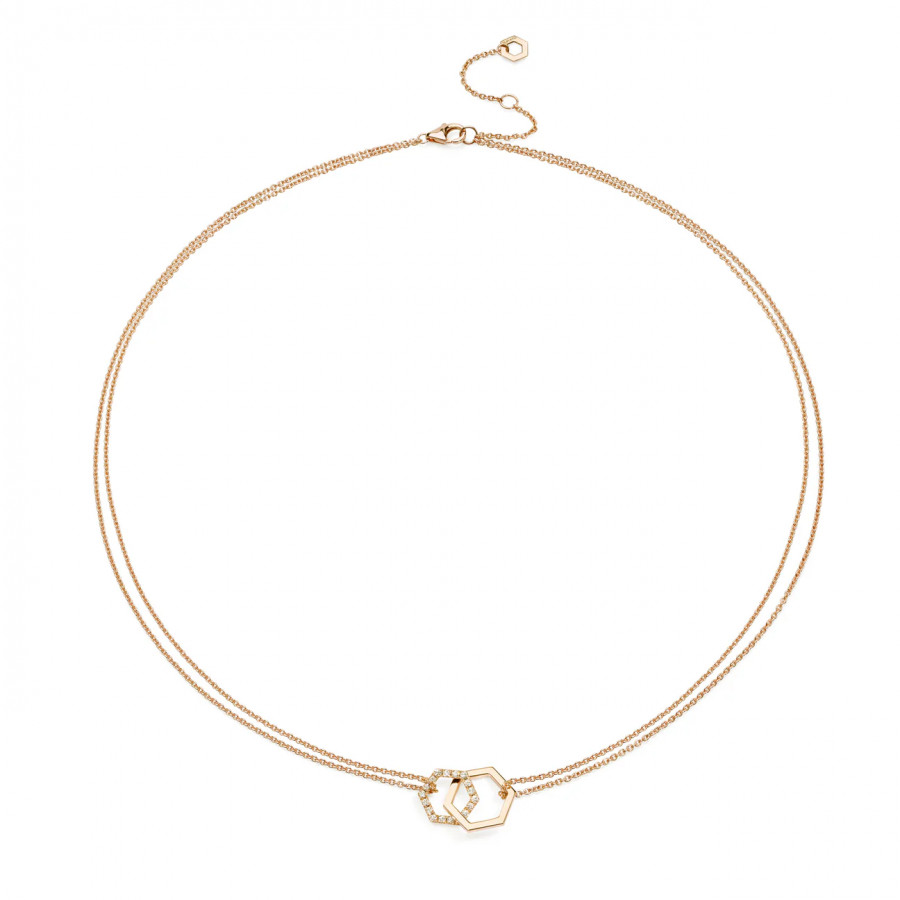 Una raffinata collana in oro giallo 18 carati con due esagoni intrecciati, simbolo di anime gemelle unite per sempre in un abbraccio prezioso. Celebra la vita e l’amore con la collana Amuleto Double Yellow.