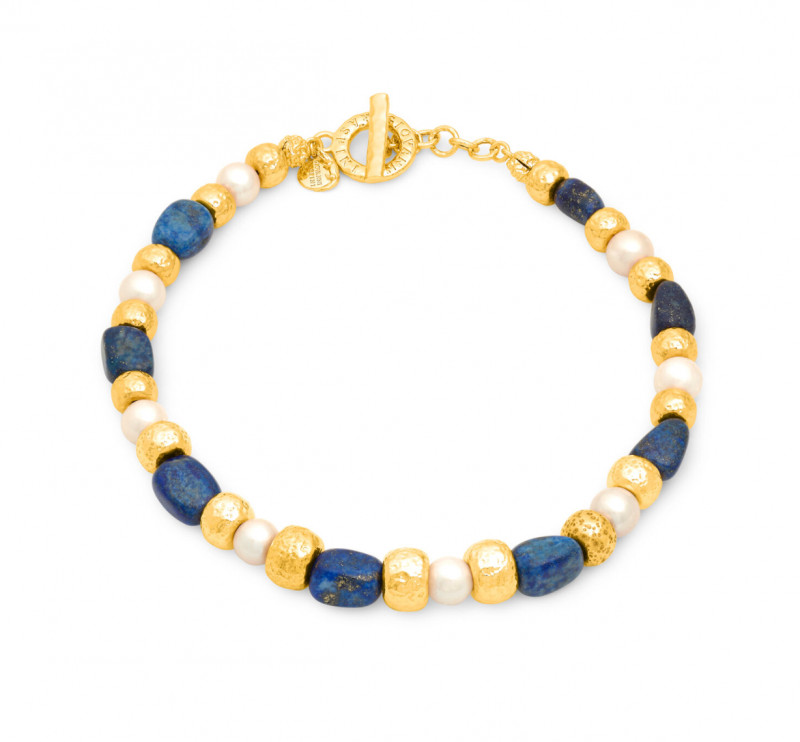 Questa raffinata collana propone il dialogo fra elementi in bronzo martellato dorato, perle naturali d'acqua dolce e segmenti in lapislazzuli. Munita di comoda chisura a T - bar con medesima finitura martellata. Tutto il fascino della fusione a cera persa per un gioiello realizzato completamente a mano in azienda.