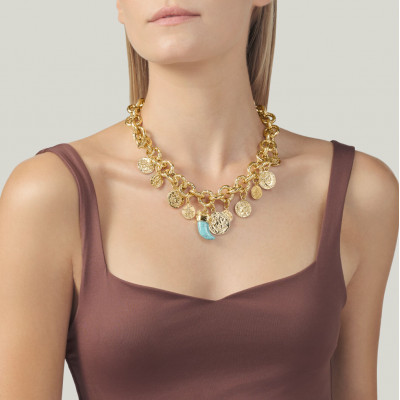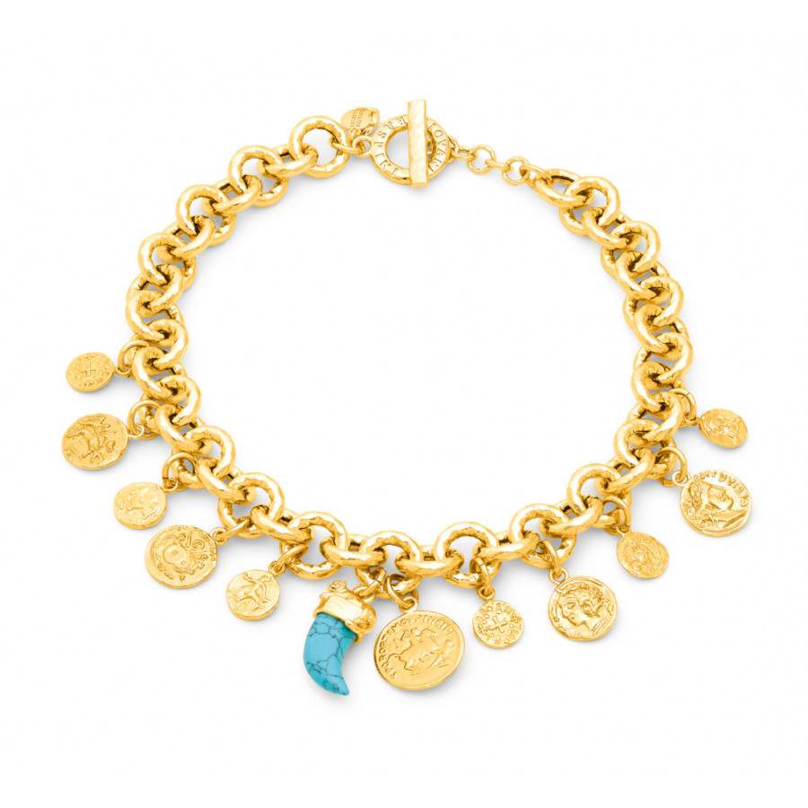 Una catena a maglia tonda in bronzo dorato con finitura martellata si arricchisce di monete e di una zanna in pasta di turchese, avvolta da un elemento decorativo a forma di puma, dando vita a una collana luminosa dalle calde cromie. Completa di una chiusura a T-bar, esprime tutto il fascino della fusione a cera persa. Un gioiello fatto a mano, che unisce forza, eleganza e artigianalità.
