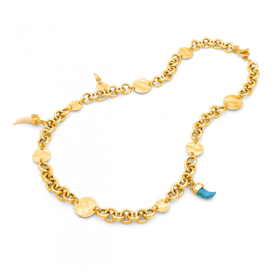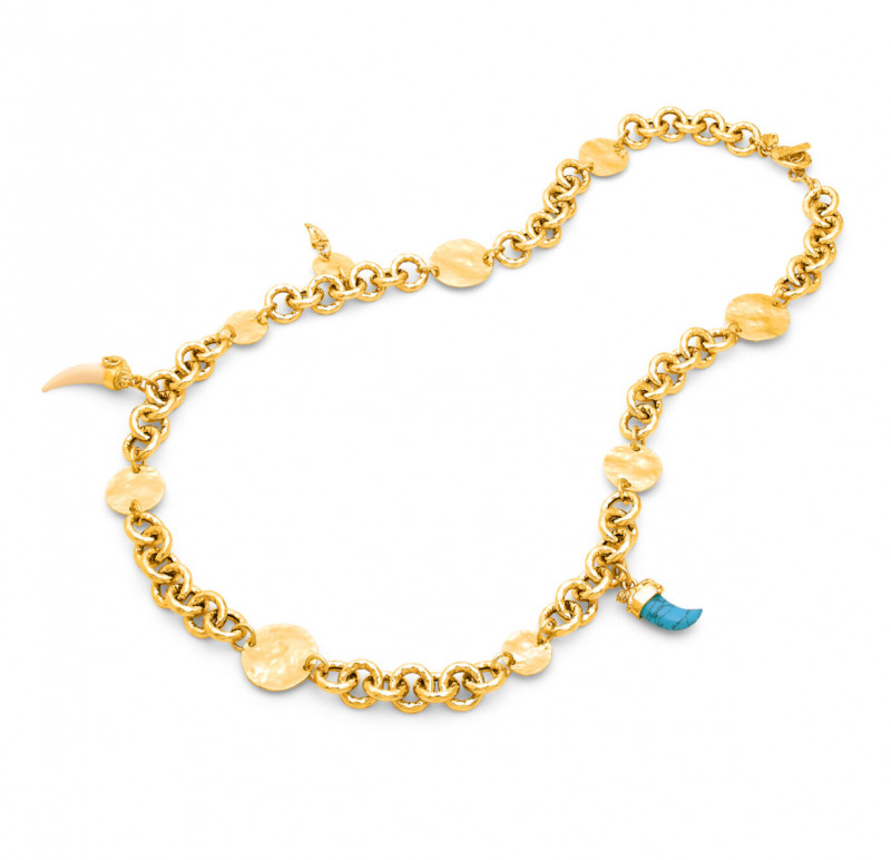 Una lunga ed elegante catena a maglia tonda in bronzo dorato con finitura martellata si arricchisce di eleganti dischi e di elementi decorativi ad ispirazione animale. Una creazione luminosa dalle calde cromie, completata da una chiusura a T-bar. Un gioiello fatto a mano, che esprime tutta la raffinatezza e la forza creativa di Giovanni Raspini.