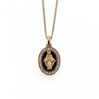 Collana in oro rosa 18kt di cm 43 con medaglia cm 1,7 (compreso anellino attacco collana) "Madonna miracolosa" e diamanti taglio brillante di ct. 0,11 complessivi e base in onice naturale di ct. 0,09.