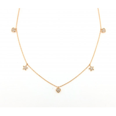 Girocollo oro rosa pendenti cuori e stelle, in oro rosa 750°%, con pendenti alternati a forma di cuori e stelle con diamanti bianchi. La collana è regolabile grazia alla chiusura a maglia.