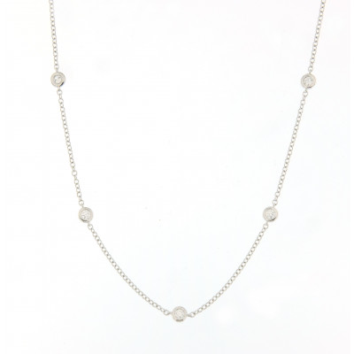 Girocollo Crivelli Punti luce inseriti oro bianco 750°%, con catena a maglia rolò, è composta da undici punti luce con diamante bianco. Questa collana è un classico intramontabile, ed incarna l’eleganza senza tempo, rielaborata in stile Crivelli. Design minimal e linee essenziali contribuiscono a dare al gioiello, purezza. Si denota anche dall’attenzione per i dettagli tipica del brand e della lavorazione artigianale orafa, Made in Italy.