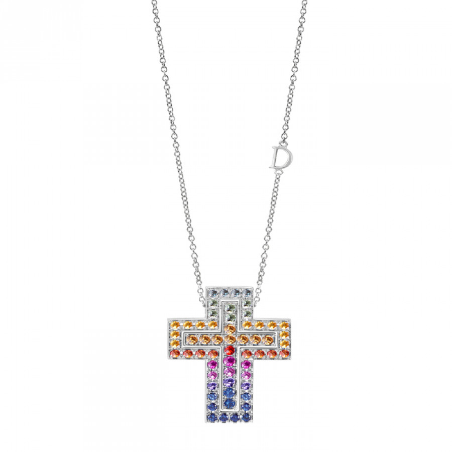 Collierino Damiani Belle Epoque con croce in oro bianco, diamanti e zaffiri