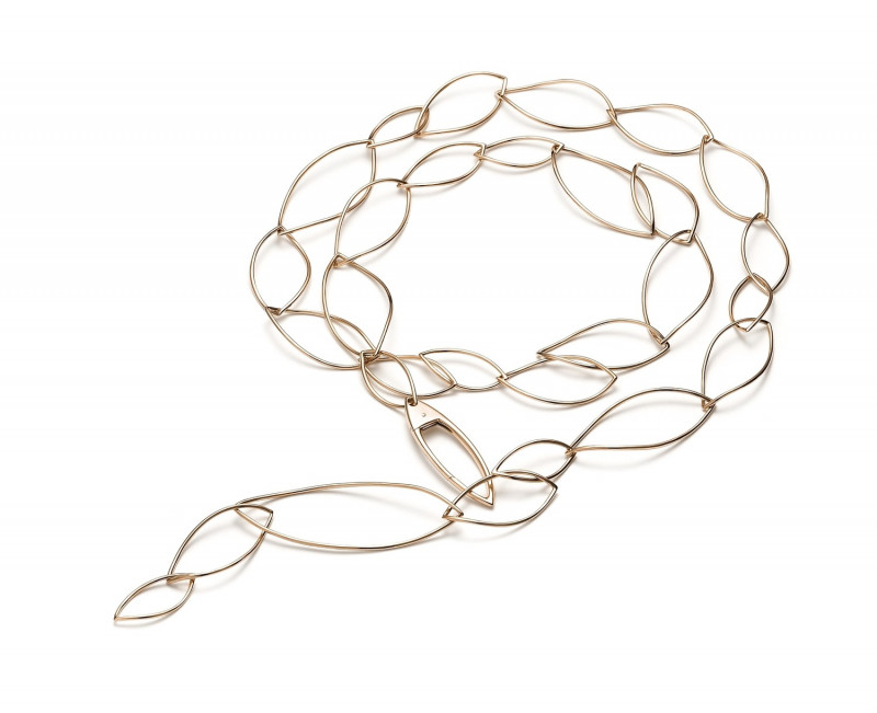 Una delle gemme preziose più ricercate, la forma della navetta è al centro di una raffinata collezione di catene in oro rosa e bianco 18 carati che include orecchini, bracciali e lunghe collane.