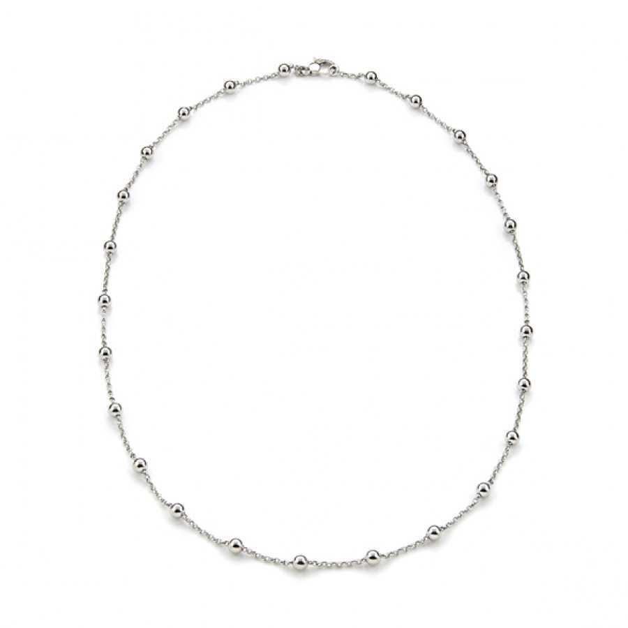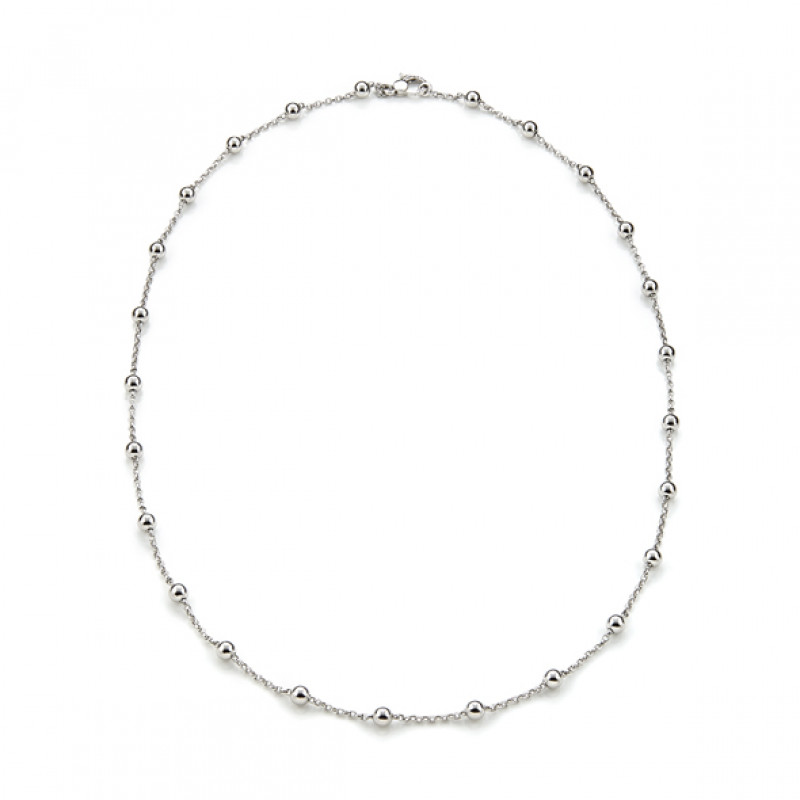 Bellezza luminosa e delicata della collana Palline, ove la catena che unisce le sferette diviene essa stessa gioiello. Argento declinato nelle forme della tradizione contemporanea. Legami infiniti di bellezza, per una collana da indossare ogni giorno.