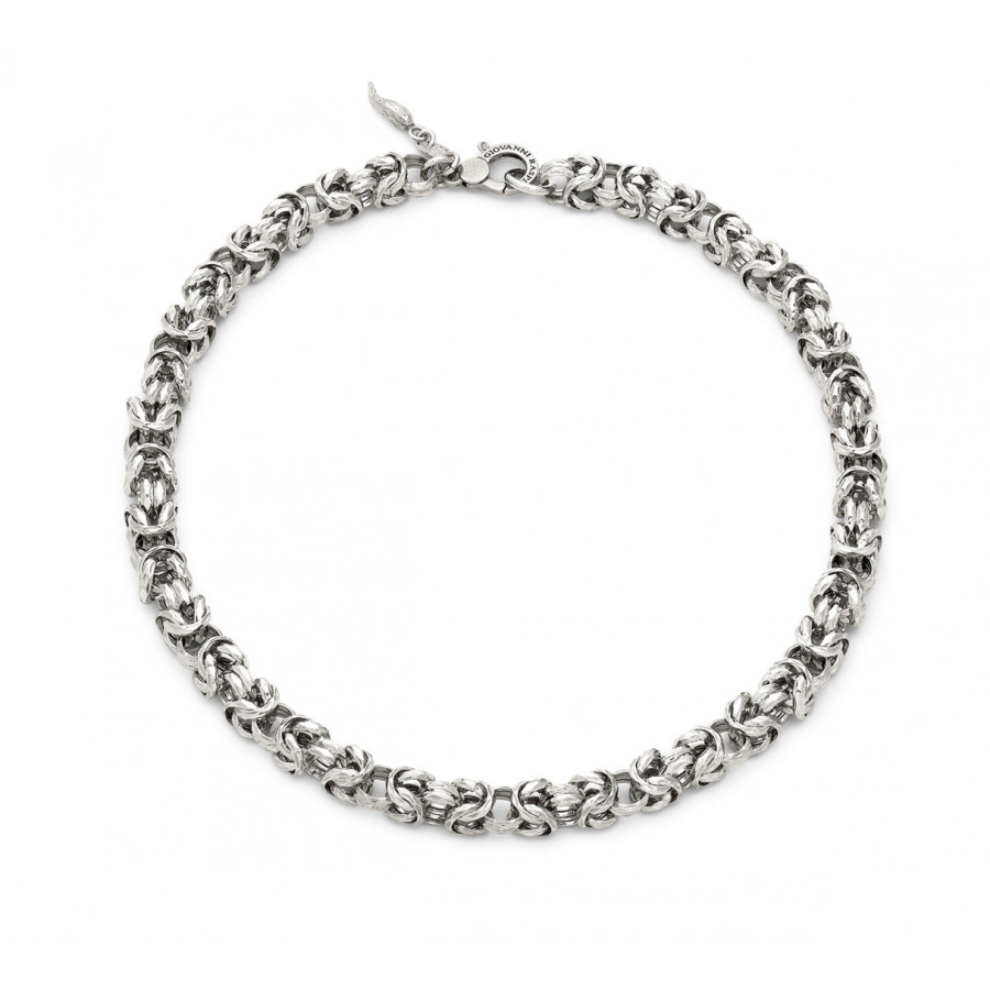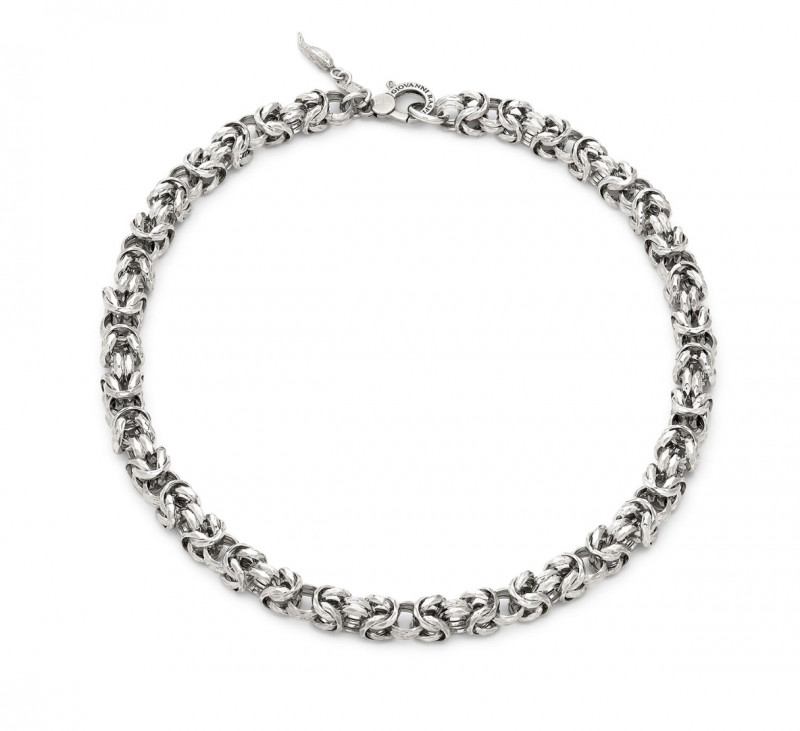 Un capolavoro di maestria artigianale firmato Giovanni Raspini, la collana Bizantina Luce reinterpreta l'iconica catena bizantina conferendole luminosità e matericità. La particolare sfaccettatura delle maglie, realizzata a mano, crea suggestivi giochi di luce e riflessi, donando all’intero gioiello una brillantezza unica.