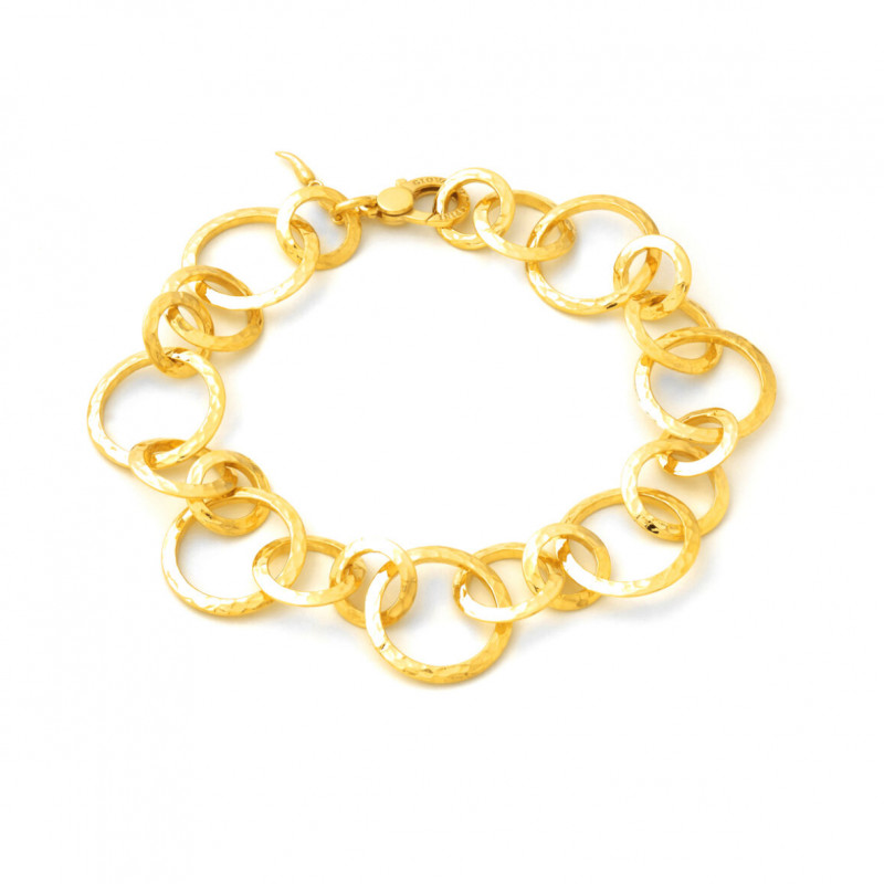 Una collana bellissima, materica, con texture che regalano una straordinaria lucentezza: anelli in tre dimensioni, realizzati con lastra d'argento martellata a mano e quindi dorata. Una collana che interpreta l'amore di Giovanni Raspini per il design contemporaneo.