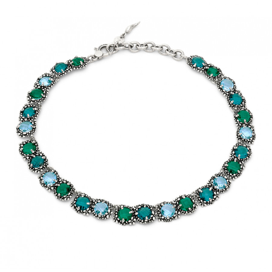 Una composizione armoniosa di ventisei grandi cristalli rotondi sfaccettati, nelle tonalità del celeste, dell’azzurro e del verde smeraldo, dona luce e carattere alla collana Blue Ivy. Il gioiello è impreziosito da un ricercato decoro realizzato con la tecnica della fusione a cera persa, ispirato al tema floreale.