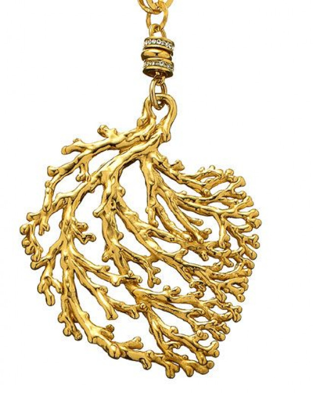 Riflessi dorati ed eleganza del decoro mostrano tutta l'eccellenza contemporanea del marchio Giovanni Raspini. Il pendente Coral in argento con bagno d'oro: un gioiello senza tempo, nato nel mare profondo. Fatto a mano, in house, e impreziosito da cristalli Swarovski.