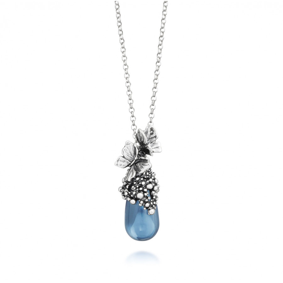 Il pendente Goccia Farfalle nasce dall’incontro tra il cristallo a goccia in una delicata sfumatura blu ciano e il decoro in argento realizzato con fusione a cera persa, che riproduce con grazia il volo di eleganti farfalle. Completa la creazione una catena rolò diamantata in argento 925, lunga 45 cm, che ne esalta la luminosità e la raffinatezza.