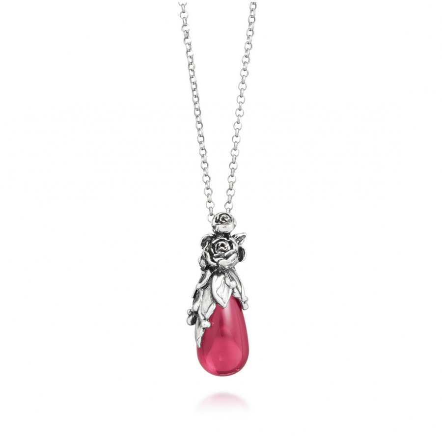La collana con pendente Goccia Peonie prende vita dall'incontro armonioso tra un decoro floreale in argento modellato con la tecnica della fusione a cera persa, ispirato alla grazia senza tempo dei fiori di peonia, e un cristallo a forma di goccia nelle sfumature tenui del rosa. Completa il gioiello una catena rolò diamantata in argento di 45 cm.