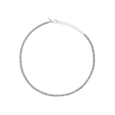 Tanti piccoli elementi circolari in argento, uniti l'uno con l'altro quasi fossero annodati. Una collana delicata ed elegante. Realizzata completamente a mano in azienda.