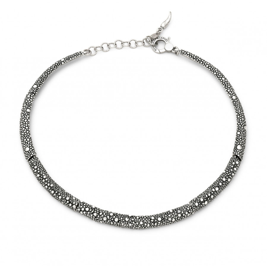 Un capolavoro di maestria orafa, la collana Petit Perlage è una raffinata creazione semirigida che celebra l’arte della fusione a cera persa. Il pavé di sferette in argento brunito, impreziosito da una delicata diamantatura, crea un suggestivo gioco di luci ed ombre che conferisce all’intero gioiello una texture contemporanea e sofisticata.