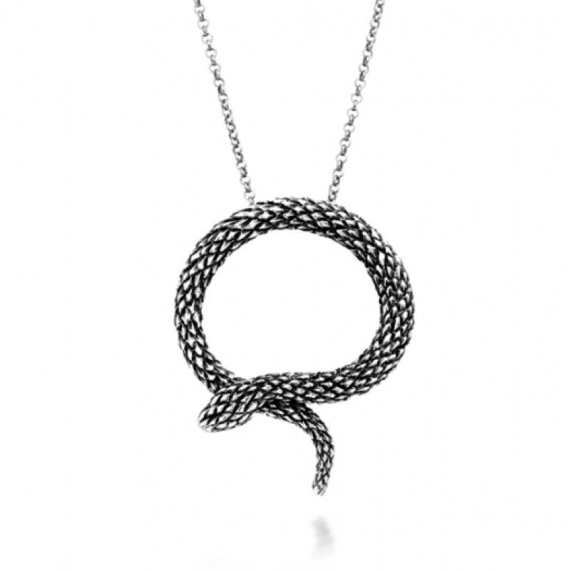 Collezione Serpente - Un serpente arrotolato si fa pendente contemporaneo, dando vita ad un gioiello elegante e di facile indosso fatto a mano. Texture di argento brunito e scaglie lucenti di rettile per il pendente Serpente di Giovanni Raspini.