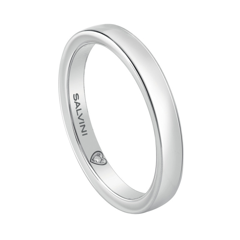 Fede nuziale in oro bianco con diamante, della collezione Battito di Salvini.