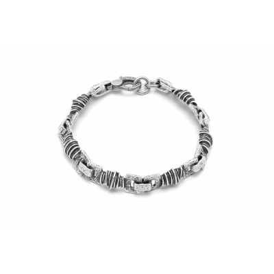 Il Bracciale Anthony è assolutamente unico. Realizzato in argento, fuso con la tradizionale tecnica della cera persa, vanta un decoro particolarissimo, che alterna elementi in filo con moduli quadrangolari incernierati. Fatto a mano in azienda.