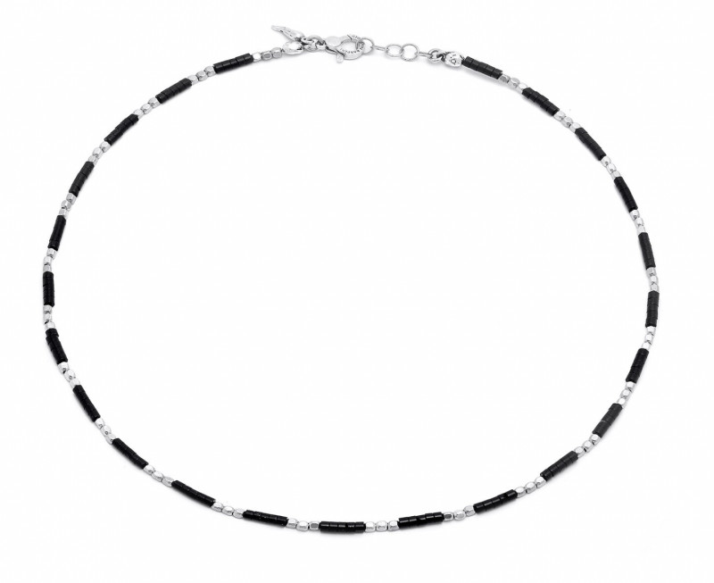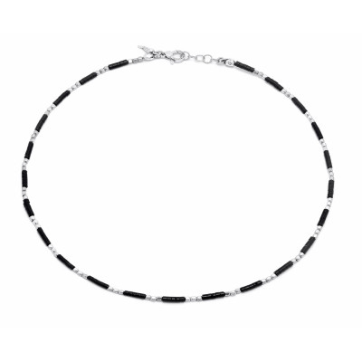Tutta la semplice leggerezza di una collana contemporanea. Nella collana da uomo Onice e Dadini, il colore nero della pietra ed elementi in argento fuso e brunito duettano al collo di un uomo, con prevalenza ritmica del decoro in onice. Realizzata a mano in azienda.