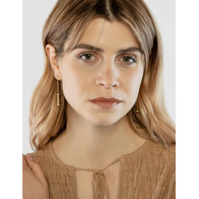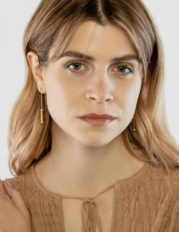 Un orecchino di design con doppia catena e parallelepipedo in oro giallo massiccio. Linee geometriche e essenziali per chi desidera un gioiello da indossare tutti i giorni ma con un tocco distintivo per rendere unico il proprio outfit.