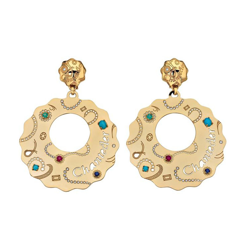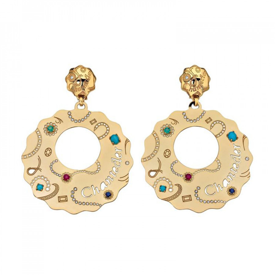 Orecchini Chantecler grandi in oro giallo con turchese, zaffiri, rubini, smeraldi e diamanti, appartenente alla collezione Suamèm.