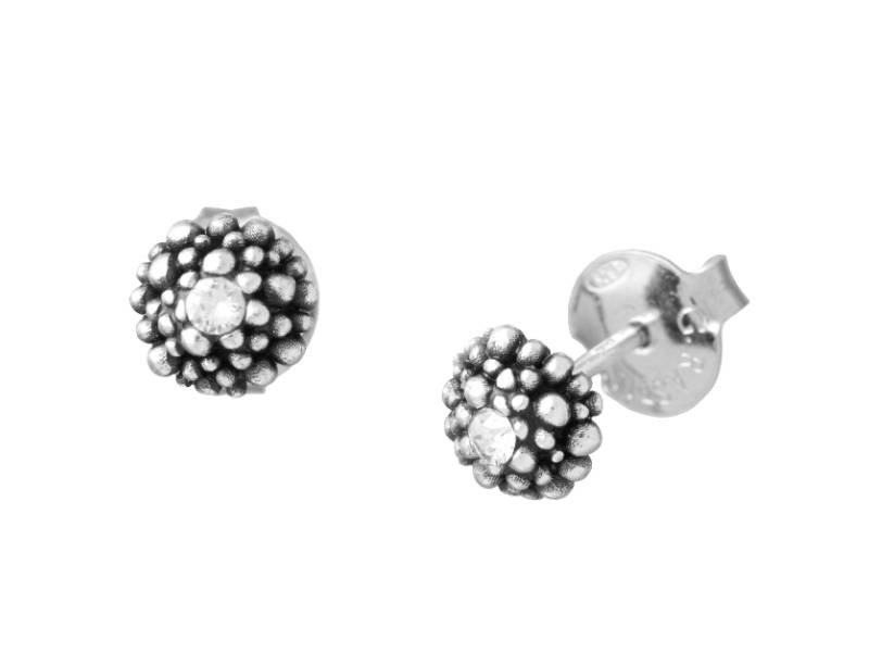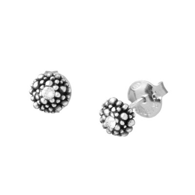 In questi orecchini l'argento brunito, nella forma di tante micro sferette luminose, incastona uno scintillante zircone. Un piccolo grande gioiello che dona luce al volto con eleganza.