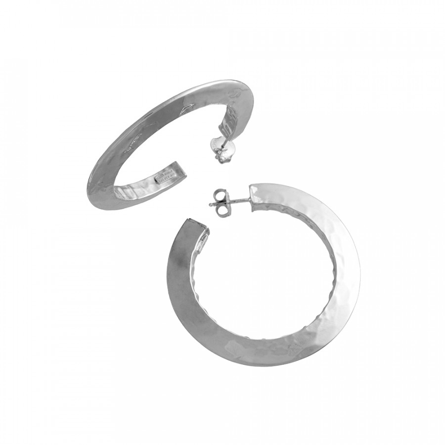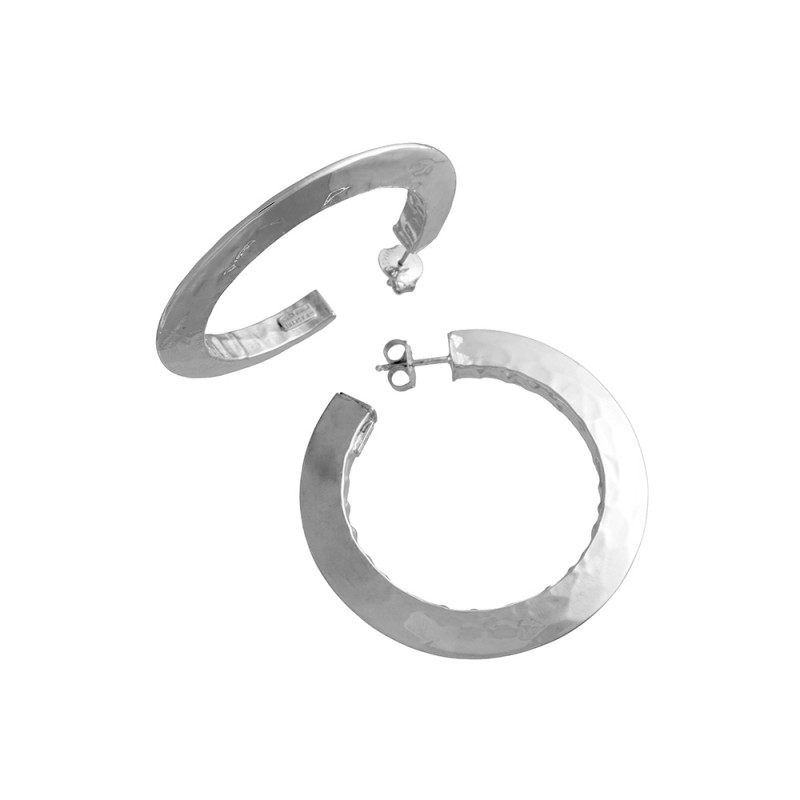 La forma più perfetta, il cerchio. Un metallo martellato e luminosissimo, l'argento. Orecchini che esprimono il connubio ideale tra forza e contemporaneità nello stile Giovanni Raspini. Caratterizzati da linee che disegnano forme decise ed eleganti, vengono realizzati completamente a mano in azienda.