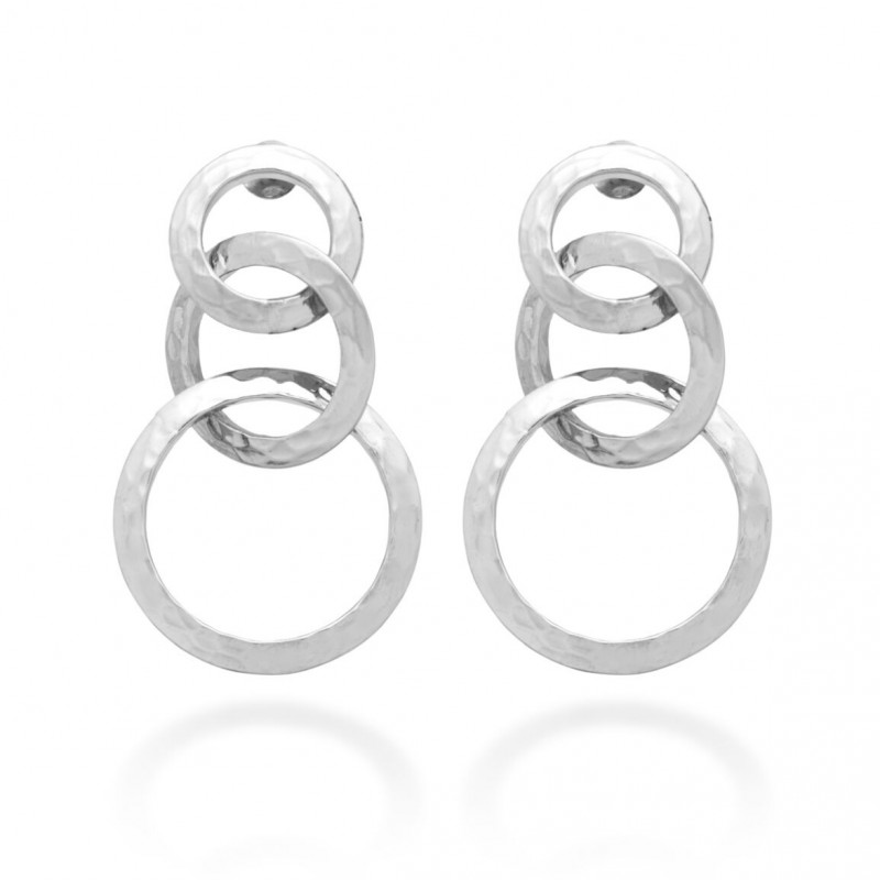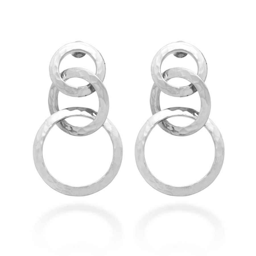 Questi meravigliosi orecchini a cascata, con anelli in tre dimensioni, mostrano una texture materica che regala una straordinaria lucentezza. Realizzati con lastra d'argento martellata a mano, raccontano la passione di Giovanni Raspini per il design contemporaneo e per la ricerca di nuove forme.
