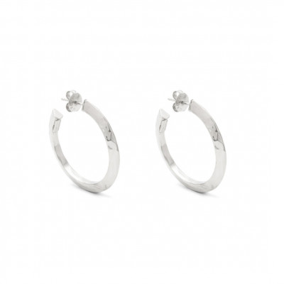 Questi orecchini a cerchio, dalla sezione triangolare e con una texture che riflette una luce intensa, sono parte della collezione Blade. Ogni gioiello è progettato per un look deciso e rock, realizzato in azienda con una lastra d'argento martellata a mano.