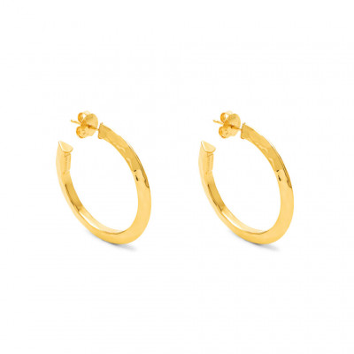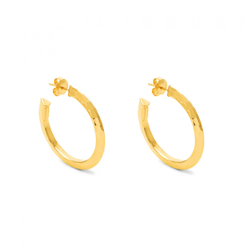 Questi orecchini a cerchio in argento dorato, dalla sezione triangolare e con una texture che riflette una luce intensa, sono parte della collezione Blade. Ogni gioiello è progettato per un look deciso e rock, realizzati in azienda con lastra d'argento martellata a mano e quindi dorata.