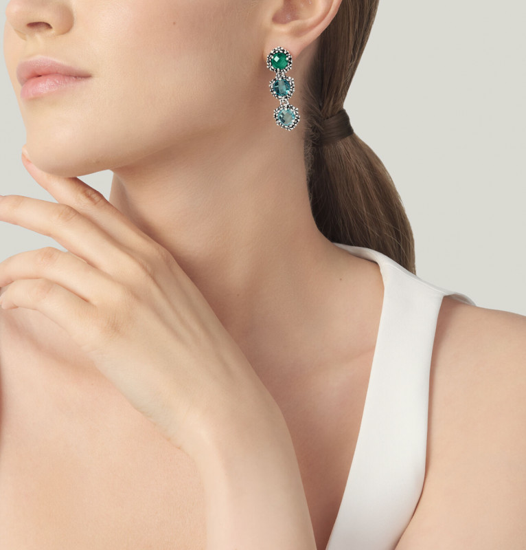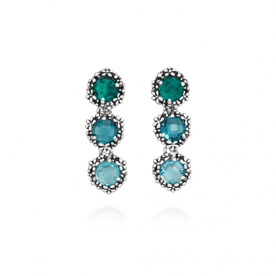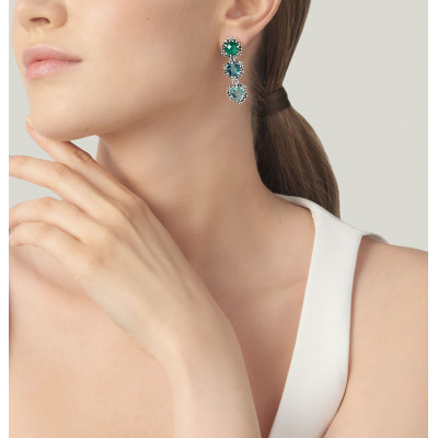 Negli orecchini Cascata Blue Ivy tre cristalli rotondi sfaccettati, declinati nelle delicate tonalità del celeste, azzurro e verde smeraldo, si fondono armoniosamente con un pregiato decoro floreale, realizzato con la tecnica della fusione a cera persa.