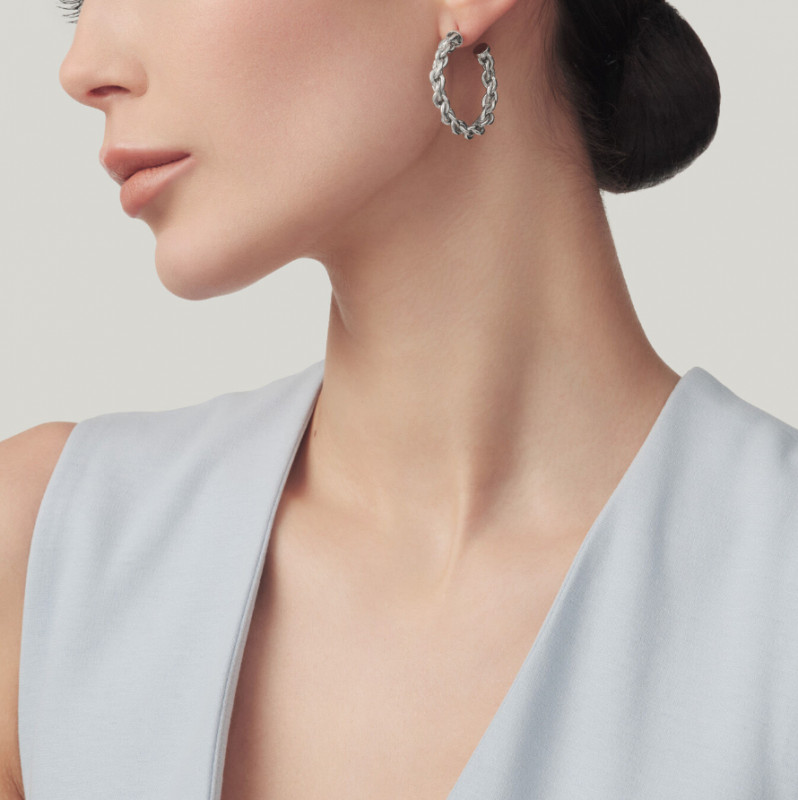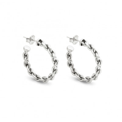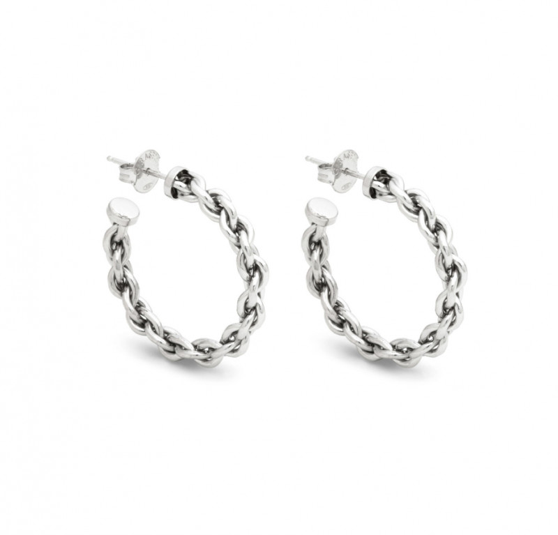 Per una donna che ama la bellezza dell'unicità, Giovanni Raspini propone questi eleganti orecchini a cerchio in argento fuso a cera persa. La forma di questi orecchini si ispira ad una catena classica, ma con effetto rigido. Fatti a mano in azienda. Per una donna che ama la bellezza della semplicità.