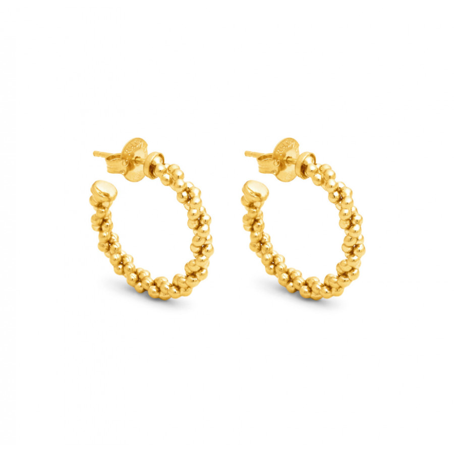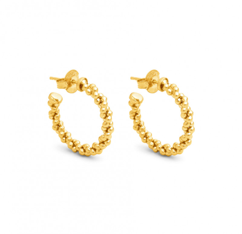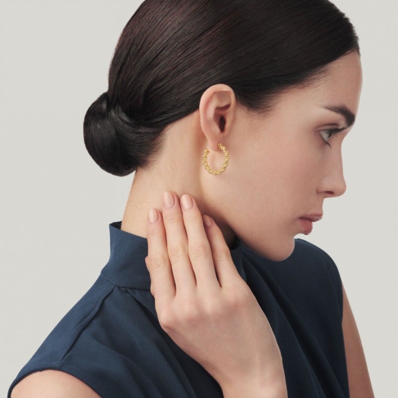 Giovanni Raspini propone questi piccoli ed eleganti orecchini a cerchio in argento dorato fuso a cera persa. Raffigurano una catena intrecciata, con effetto rigido. Fatti a mano in azienda per una donna che ama la bellezza dell'unicità.
