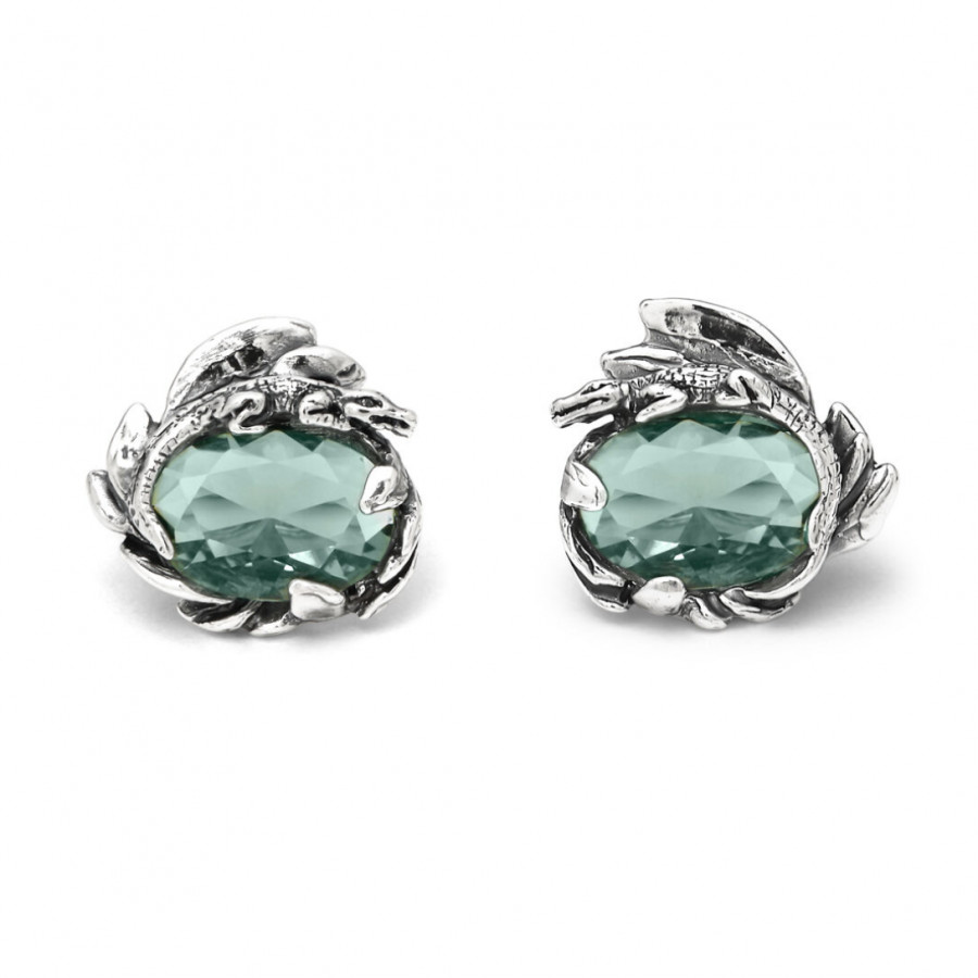 Tradizione e bellezza: la fusione a cera persa dell'argento incontra la delicatezza del quarzo color verde. Maestosi coccodrilli sovrastano le pietre degli orecchini ponendole in evidenza.